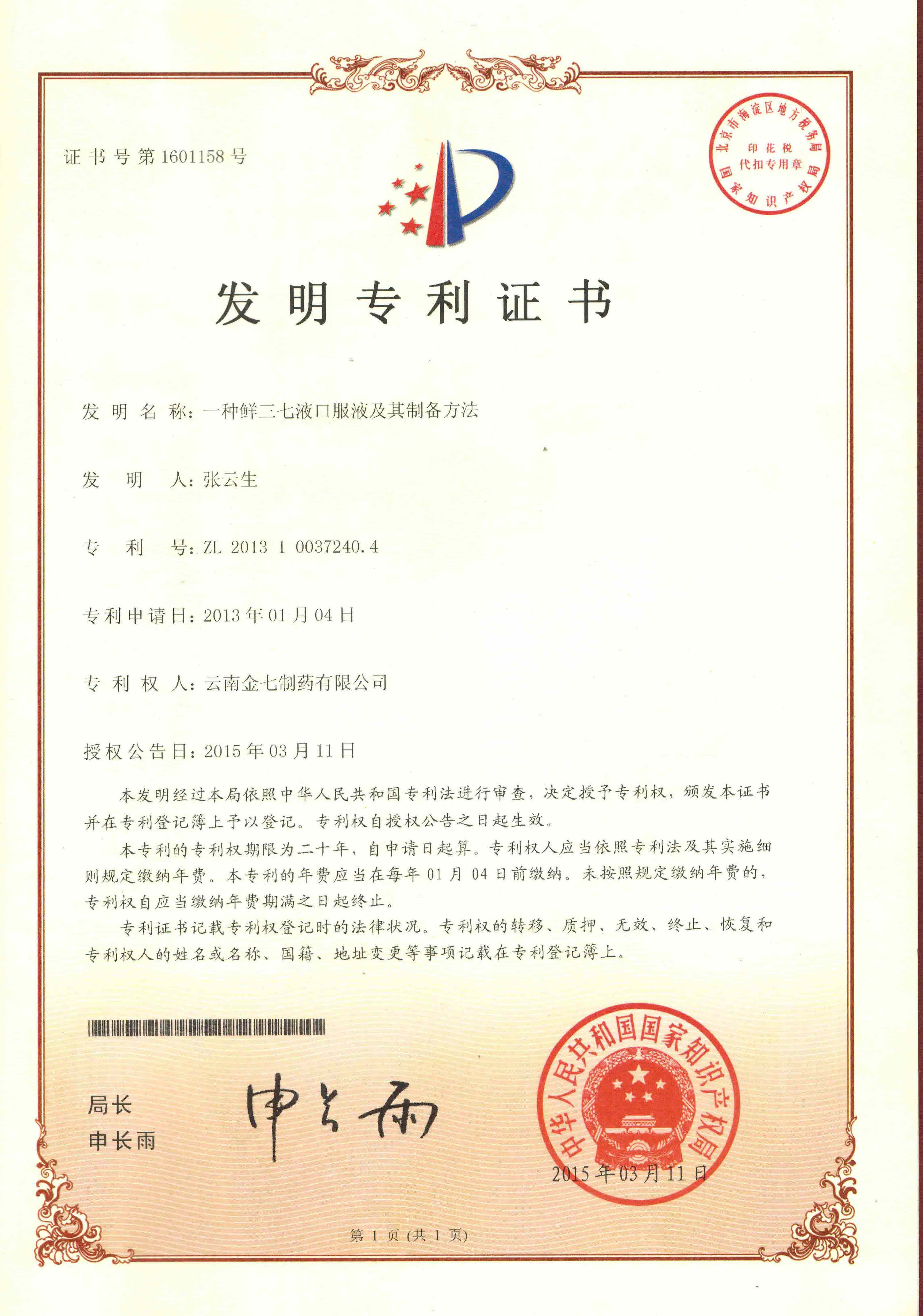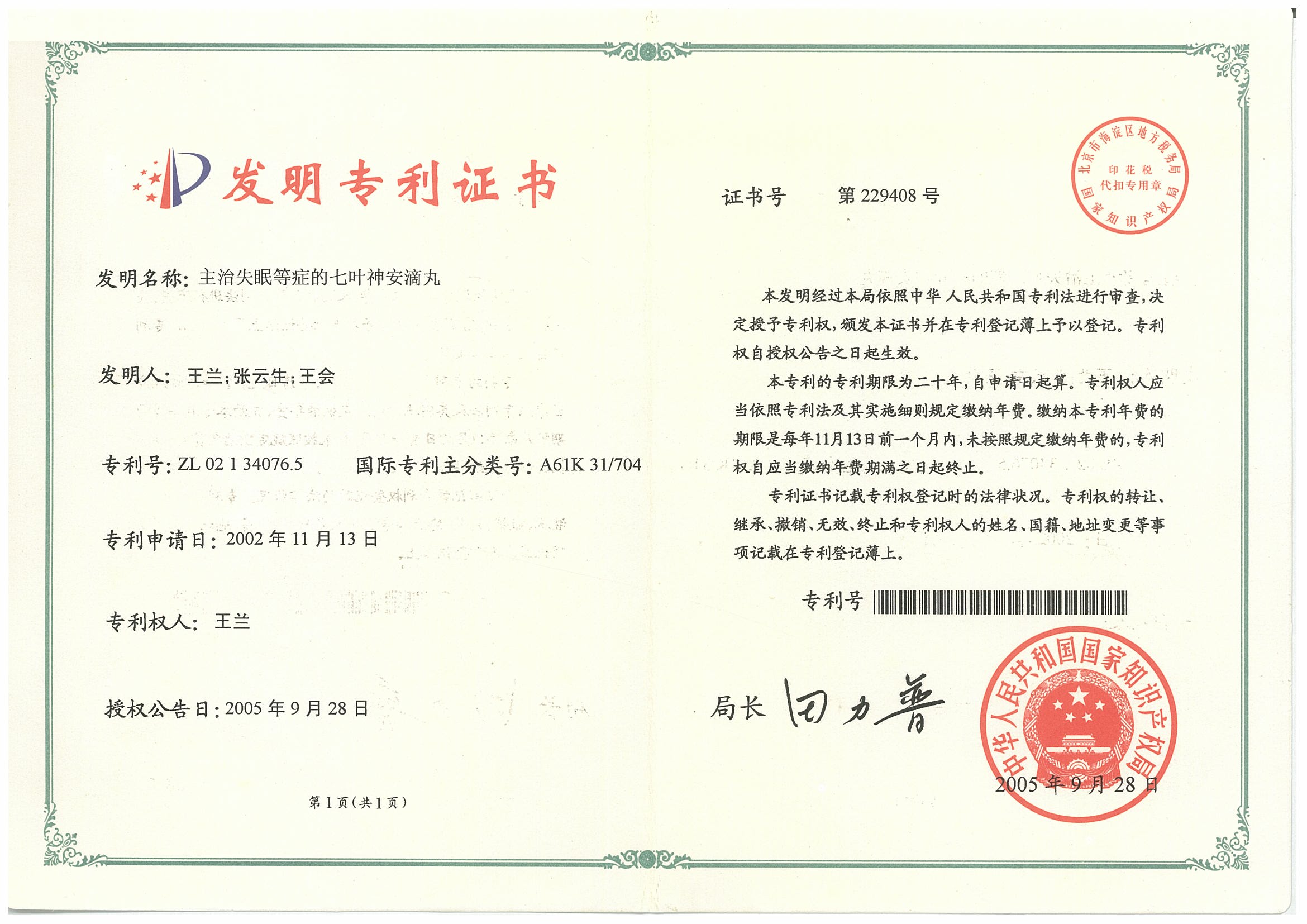 藥品生產(chǎn)批準(zhǔn)文號(hào)8個(gè),保健食品批準(zhǔn)文號(hào)2個(gè),其中藥品七葉神安滴丸、保健食品三七口服液為全國(guó)獨(dú)家專利品種。